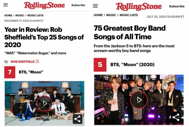 'Moon'은 그 뿐만 아니라 미국의 유명 음악 매거진 롤링스톤(Rolling Stone)선정 '올타임 최고 보이밴드 노래 75곡'에서 5위를 차지했다. 이는 아시아 전체에서 최고 순위이며 수많은 팝 음악을 제치고 톱5에 올라 K팝의 위상을 높였다.