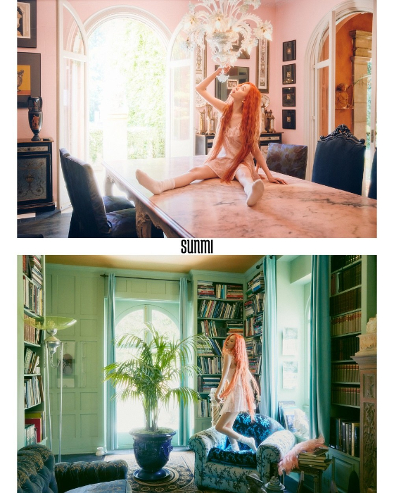 이어 세 번째 콘셉트 포토에서는 테이블 위, 서재 안의 소파 등 실내에서도 다양한 포즈로 시선을 사로잡았다. 또한 양갈래로 길게 머리를 땋아내린 선미의 뒷모습까지 담겨 팬들의 눈길을 모았다.