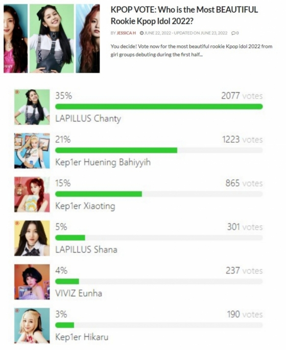 걸그룹 라필루스(Lapillus)의 멤버 샨티(Chanty)가 '가장 아름다운 K팝 아이돌' 투표에서 압도적인 1위를 기록하며 인기를 빛냈다.