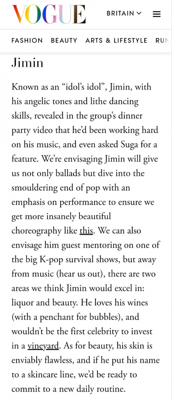 영국 '보그'는 방탄소년단의 개별 활동 예고 이후, 멤버별 각각의 활동을 예측하며 특히, 지민을 '아이돌의 아이돌'이라고 칭하고 K팝에서 뿐만 아니라 다양한 분야에서의 솔로 프로젝트에 대한 높은 기대를 보였다.