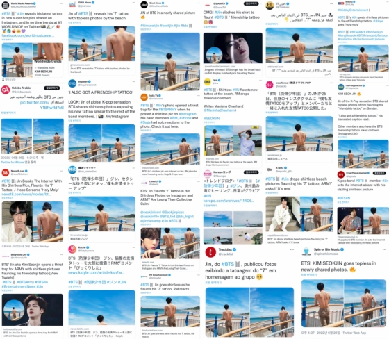 필리핀 매체 필리핀스타(PhilippineStar)도 진의 사진과 함께 "K-Pop 돌풍을 일으키고 있는 방탄소년단의 진이 '우정 타투'를 드러낸 상반신 사진을 공유했다."며 집중보도했다.