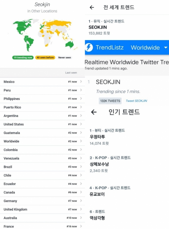 진의 인스타그램에 사진이 공개된 후 트위터에는 진의 본명인 'Seokjin'이 전세계 실시간 트렌드 1위에 올랐으며 미국, 아르헨티나, 멕시코, 페루, 필리핀, 푸에르토리코 실시간 트렌드 1위에 오르는 등 뜨거운 화제성을 입증했다.