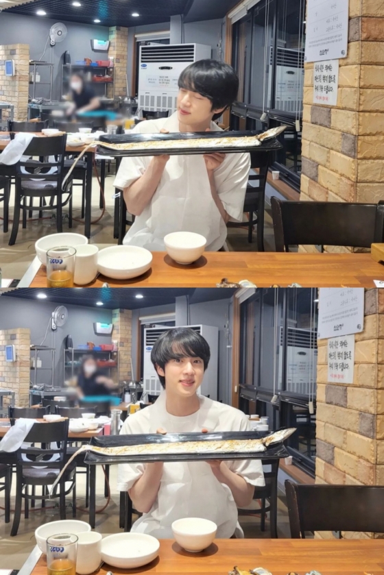 공개된 사진 속 진은 커다란 갈치구이를 들고 미소를 지으며 카메라를 응시, 흰색 셔츠 하나만 입고도 변함없는 완벽 비주얼을 자랑해 감탄을 자아냈다.