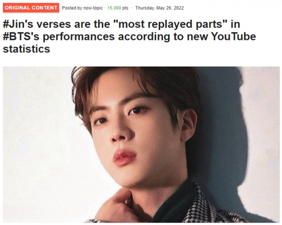 해외매체 올케이팝(Allkpop)은 "새로운 유튜브 통계에 따르면 진이 부른 구절이 방탄소년단의 공연에서 '가장 많이 재생된 부분''이라는 제목의 기사를 게재, 팬들의 주목을 받았다.