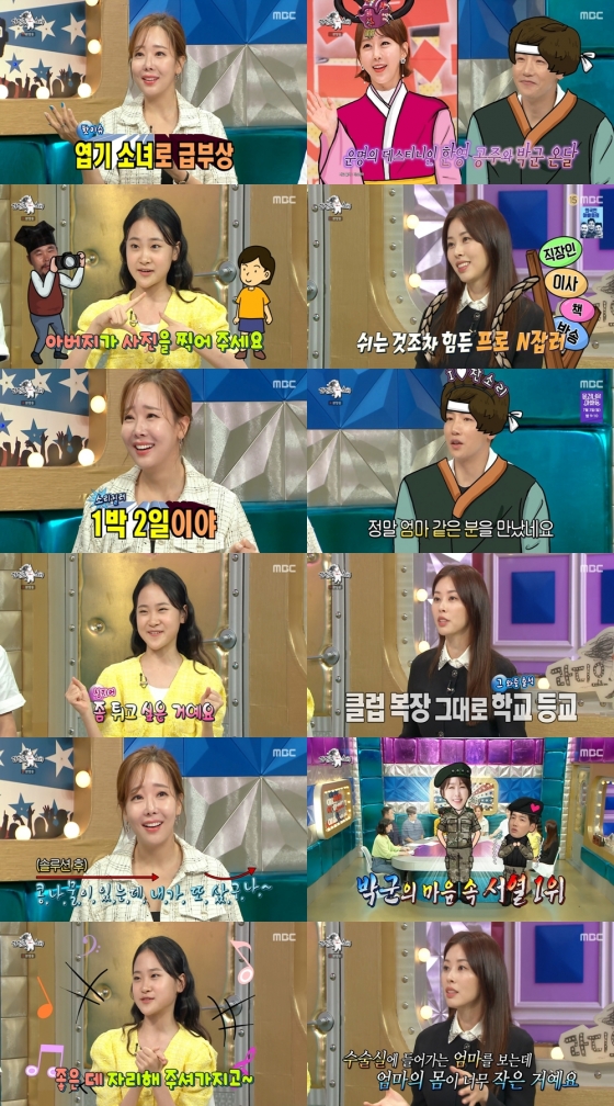 '라스'에 첫 출연한 '트로트 국악 요정' 김다현은 혀 개인기부터 높은 싱크로율을 자랑하는 '파라파라퀸' 댄스까지 다양한 개인기를 선보이며 활약했다. '보이스트롯' 준우승, '미스트롯2' 미에 등극한 이후 아버지인 김봉곤 훈장이 매니저가 됐다면서 "식당 가면 아버지가 사진을 찍어주신다"고 달라진 위상을 전했다. 이어 '고향 선배' 정동원과 더불어 하동에 자신의 이름을 딴 길을 선물 받았다고 밝혀 눈길을 끌었다.