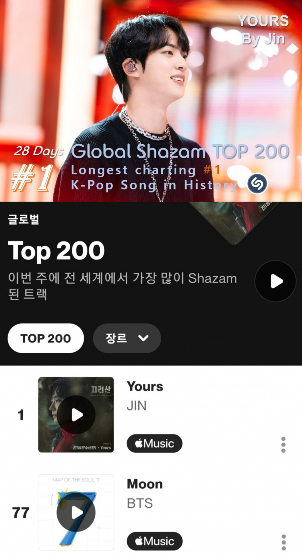 방탄소년단(BTS) 진의 'Yours'(유어스)가 세계 최대 음원 검색 플랫폼 샤잠(Shazam)에서 또다시 최초·최장 1위 신기록을 세우며 은빛 파워를 과시했다.