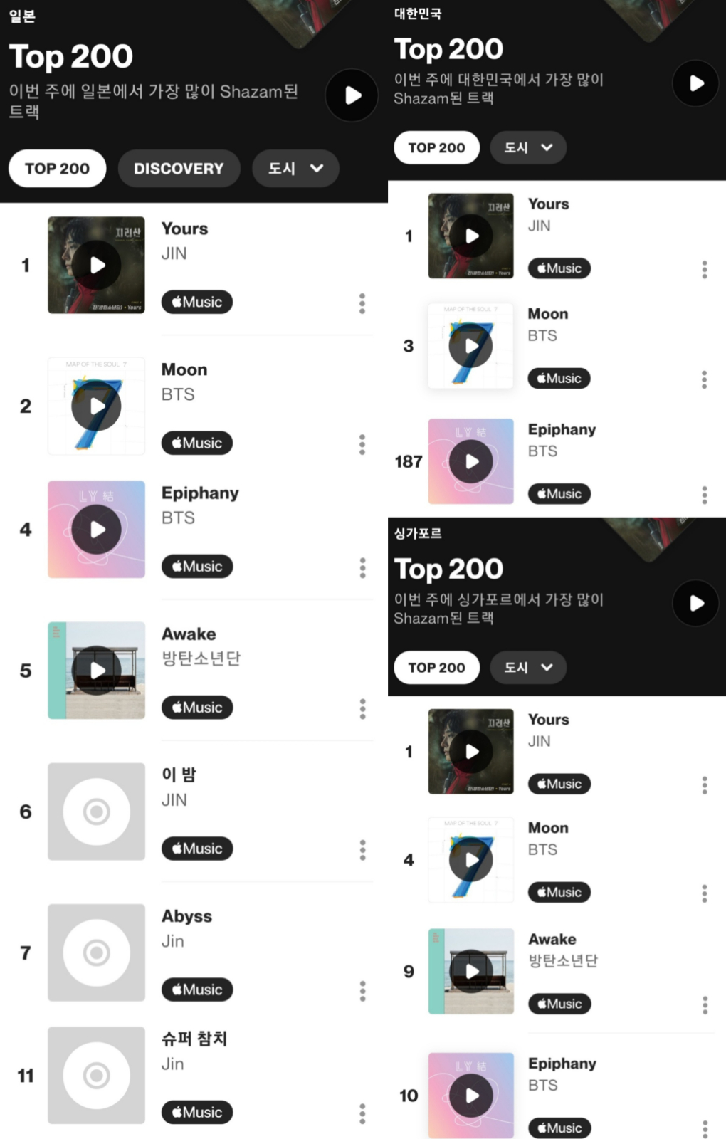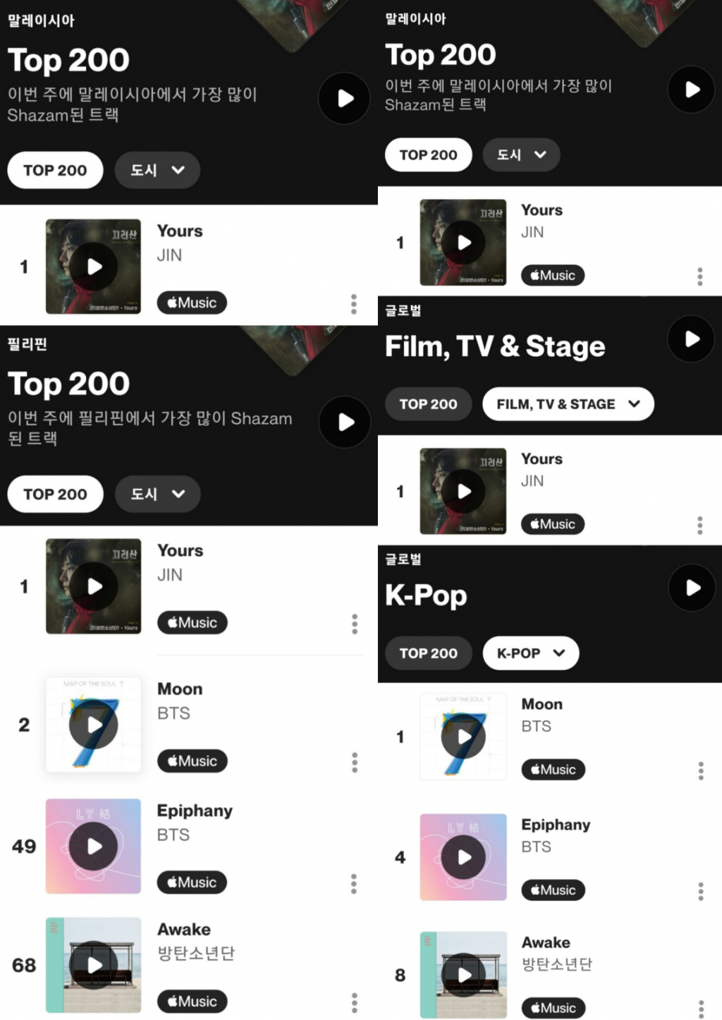 샤잠 '한국 TOP200' 차트에서도 진의 'Yours'는 43일 연속 1위를 차지하며, 54일의 1위를 기록했다. 해당 차트에 진의 솔로곡 'Moon'이 3위를 기록하며 진의 솔로 2곡이 18일 연속 'TOP3'에 차트인하는 강력한 브랜드 파워를 보여주고 있다.