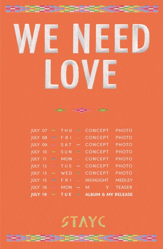 스테이씨(수민, 시은, 아이사, 세은, 윤, 재이)는 6일 0시 공식 SNS를 통해 세 번째 싱글앨범 'WE NEED LOVE (위 니드 러브)'의 스케줄러를 공개했다.