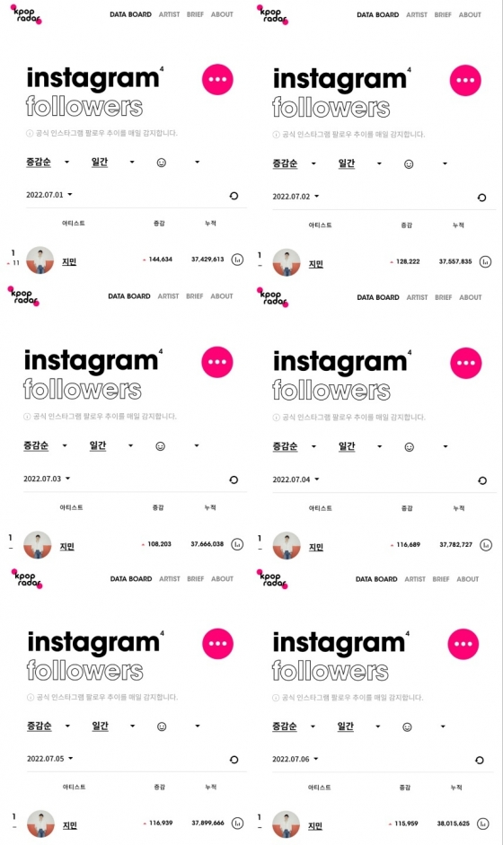 케이팝 레이더에 따르면 7월 1일 부터 6일까지 총 6일간 지민의 인스타그램은 매일 10만명 이상의 팔로워가 증가했다.