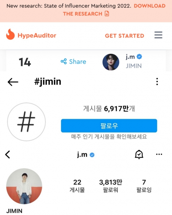 지민의 고유 해시태그 '#jimin'은 8일 현재 6917만 건을 넘기며, 자신이 세운 '세계 인물 1위' 기록을 꾸준히 경신중이다.