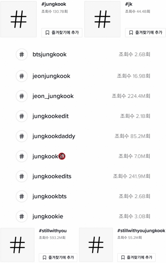 정국의 5개 해시태그의 합산 조회수만 해도 총 1976억뷰에 달한다.