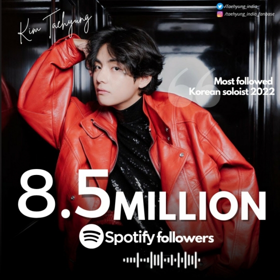 방탄소년단(BTS) 뷔가 세계 최대 음원 플랫폼 스포티파이(spotify) 팔로워 850만 명을 돌파하며 솔로아티스트로서 존재감을 빛냈다.