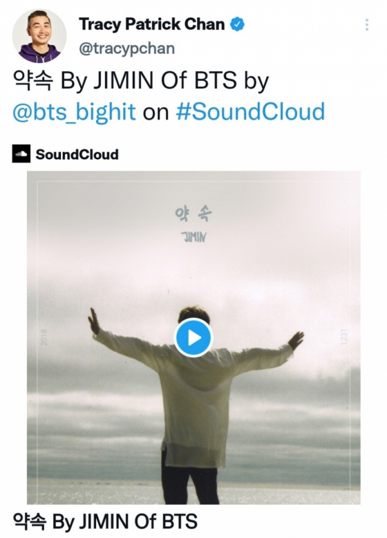 지난 3일 세계 최대 스트리밍업체 사운드 클라우드(SoundCloud)의 크리에이터 부사장(Vice President of Creator)으로 Spotify for Artists 및 YouTube Analytics의 제작자이자 전 Twitch 음악 책임자를 지낸 트레이시 패트릭 챈(Tracy Patrick Chan)이 자신의 트위터 계정에 '약속'(Promise)링크를 공유하며 높은 관심과 애정을 드러냈다.