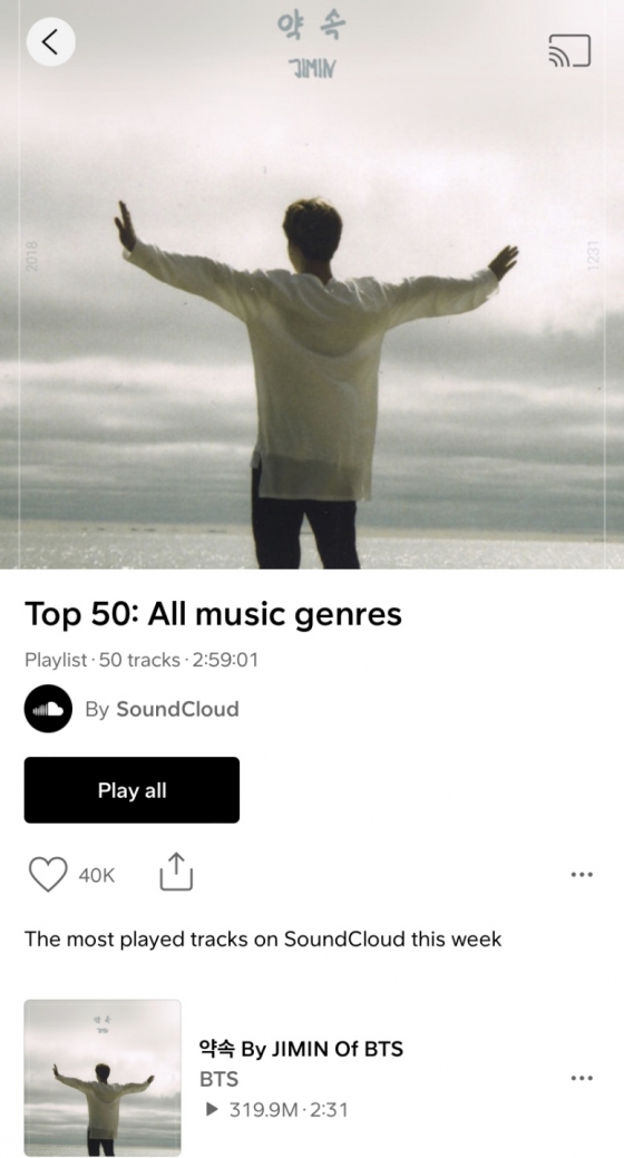 방탄소년단(BTS) 지민의 첫 자작곡 '약속'이 사운드 클라우드를 대표하는 곡이자 운영진 애정곡으로 명성을 빛냈다.