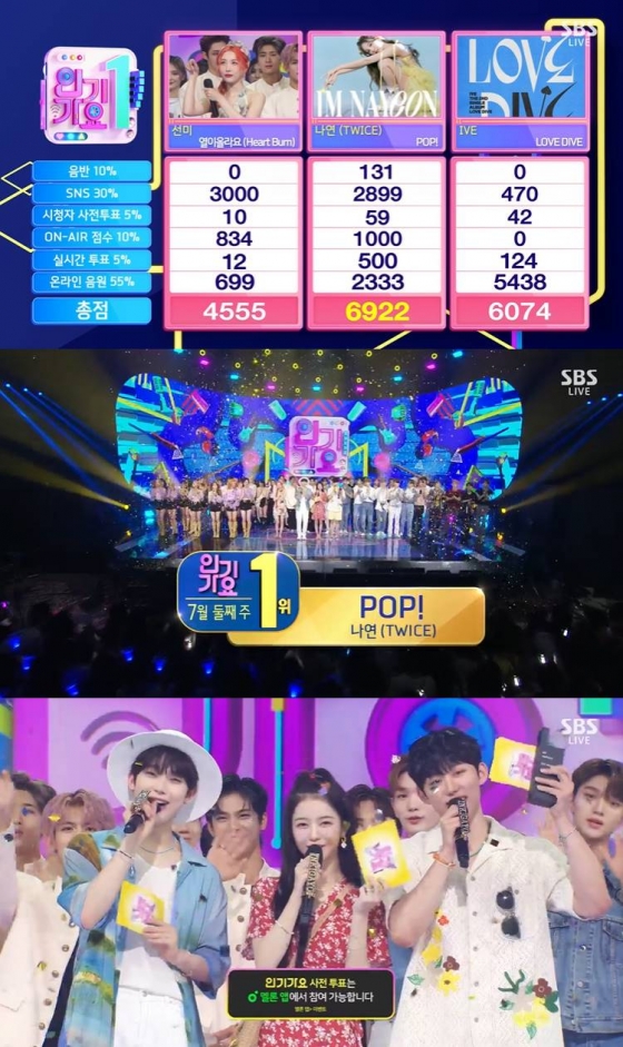 10일 오후 방송된 SBS 음악 프로그램 '인기가요'에서는 나연이 1위를 차지했다. 이날 7월 2주차 1위 후보로 선미 '열이올라요 (Heart Burn)', 나연 'POP!', 아이브 'LOVE DIVE'가 올랐다.