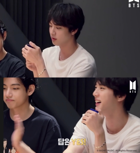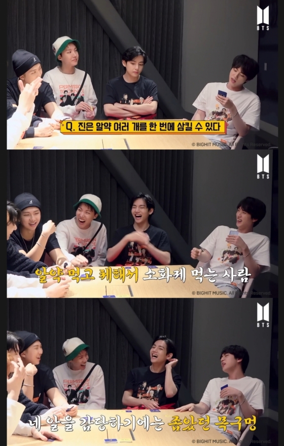 첫 질문으로 '진은 알약 여러 개를 한 번에 삼킬 수 있다?'라는 질문을 읽었다. 멤버들은 오랜 팀생활로 서로를 너무나 잘 알고 있다는 듯이 진은 알약 여러 개를 삼킬 수 없다는 의견을 저마다 내기 시작 하며 알약 먹고 체해서 소화제를 먹은 경험이 있는 진을 재밌어 하며 웃음을 터트렸다. 진은 "목구멍이 좁아서 어쩔 수 없지!"라며 변명하는 귀여운 모습을 보였다.