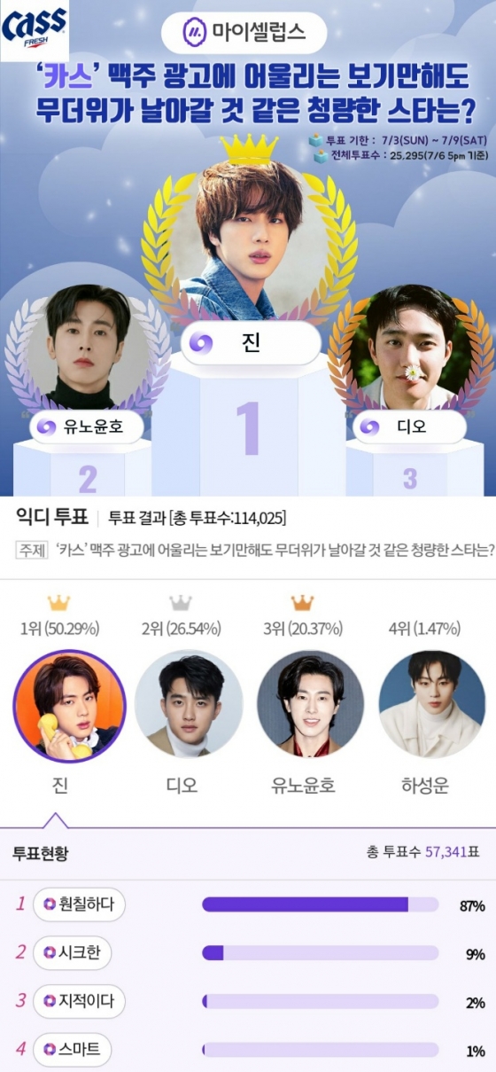 진은 7월 3일부터 7월 9일까지 익사이팅 디시에서 진행된 "'카스' 맥주 광고에 어울리는 보기만해도 무더위가 날아갈 것 같은 청량한 스타는?" 이란 설문에서 1위를 차지했다.