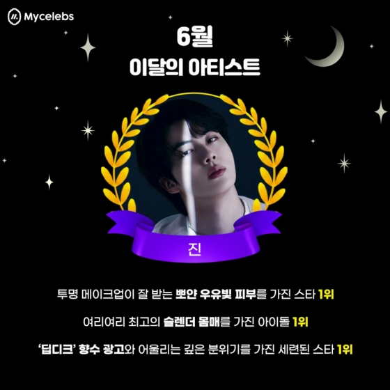 완벽한 비주얼에 뛰어난 음악적 실력까지 갖춘 진은 '마이셀럽스 소셜지수 아이돌 전체 TOP10' 6월 월간 누적 순위에서 1위를 기록하며 인기를 빛냈다.