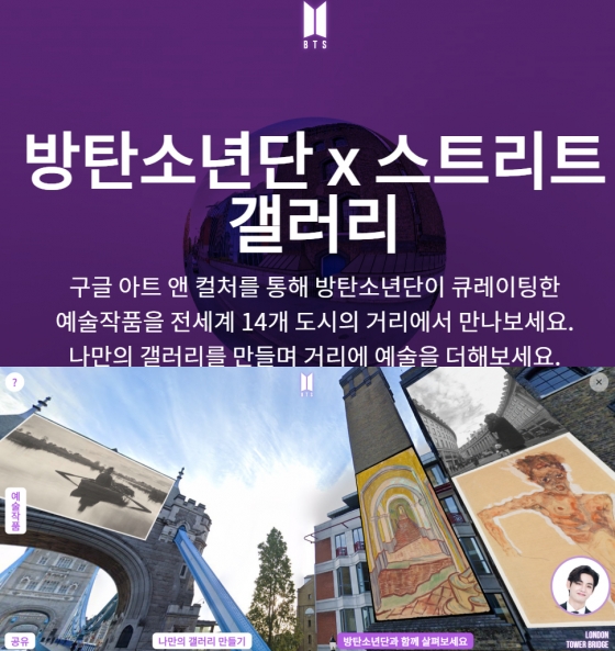 지난 9일 포털사이트 구글에는 멤버가 직접 고른 예술 작품을 서울, 뉴욕, 런던 등 세계 6곳의 전시장에 이미지로 형상화해 온라인으로 제공하는 프로젝트가 론칭됐따.