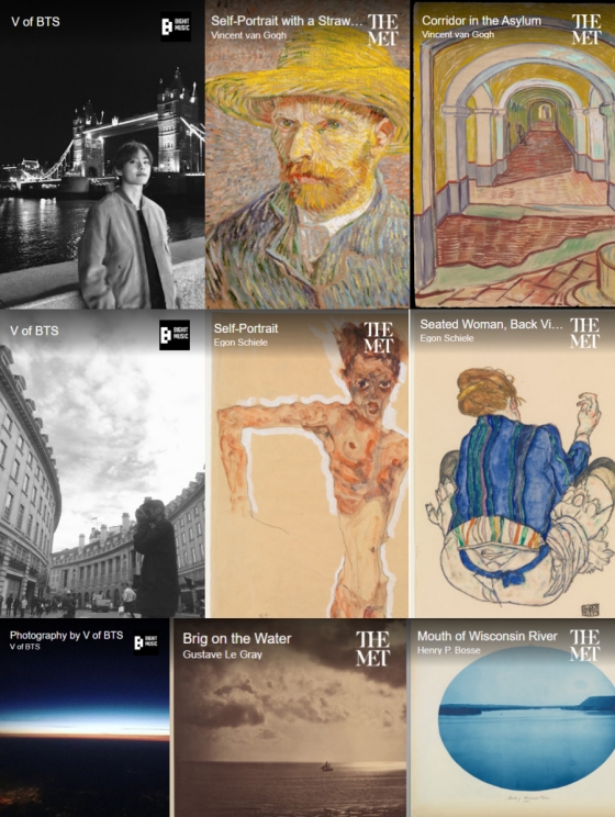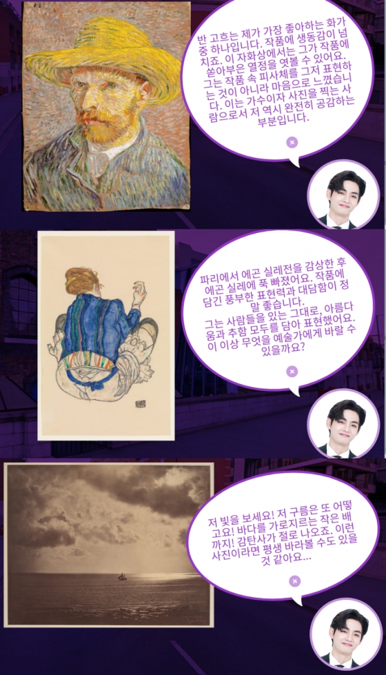 뷔는 가장 사랑하는 화가 반 고흐의 '자화상'과 '정신병원 내 복도(Corridor in the Asylum)', 에곤 실레의 '자화상'과 '뒤돌아 앉아 있는 여자(Seated Woman, Back View)' 총 4점의 그림을 선택했다.