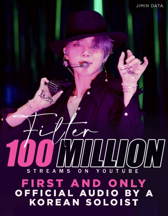 방탄소년단(BTS) 지민의 솔로곡 'Filter'(필터)가 유튜브 공식 오디오 트랙 1억 스트리밍 돌파로 한국 솔로 최초로 대기록을 세웠다.