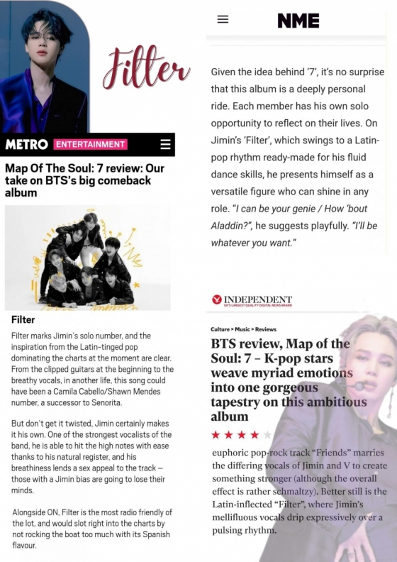 2020년 2월 21일 발매된 방탄소년단 정규 4집 'MAP OF THE SOUL:7' 수록곡인 지민의 솔로곡 'Filter'는 발매와 동시에 글로벌 음악 차트를 강타했다.