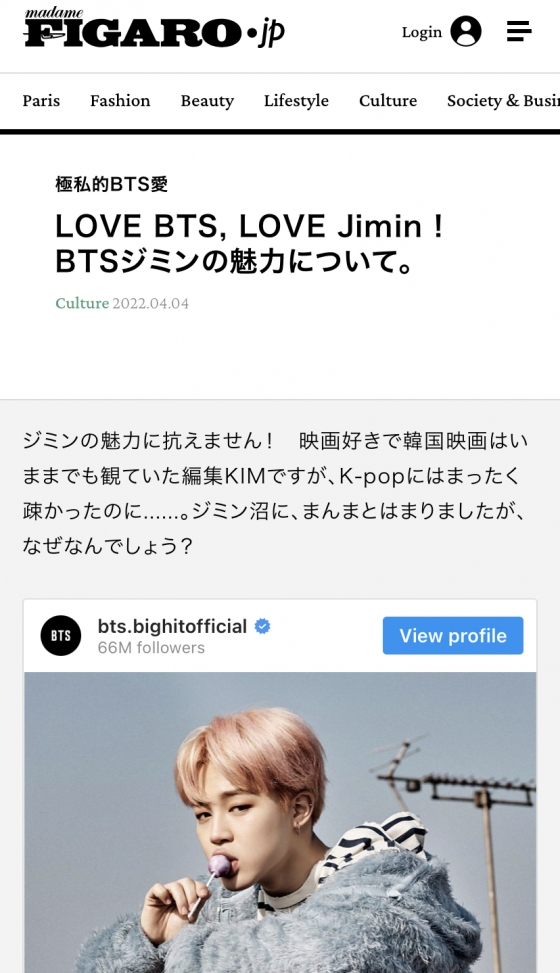 최근 일본의 라이프스타일 잡지 마담 피가로 재팬은 지민의 매력에 대한 특집 기사를 통해 지민의 춤을 극찬한 바 있다.