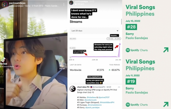 파올로의 이름이 트위터 트렌드에 올랐고, 'Sorry'는 뷔가 부른 뒤 60% 이상의 폭발적인 스트리밍 증가로 10일 필리핀 '스포티파이 바이럴 송' 차트에 28위로 진입, 11일에는 19위, OPM 송 5위를 기록했다. 'Sorry'의 가사 동영상은 조회수는 이틀 만에 4배 이상 급증하며 역주행의 역사를 썼다.