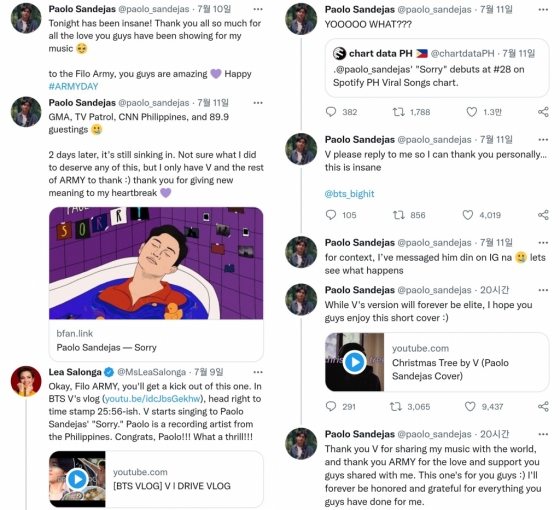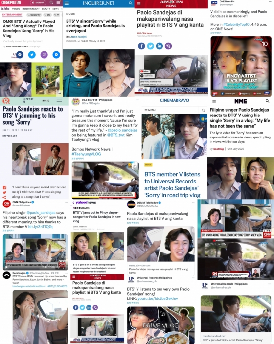 파올로는 'CNN 필리핀 뉴스'를 통해 "말이 안 나온다. 뷔가 'Sorry'를 듣고 따라 부른 뒤 잠을 못 잤다. 너무 미친 짓이다", "방탄소년단 팬들이 내 음악을 응원해줘서 너무 감사하다. 뷔를 향한 사랑이 느껴진다", "이 노래는 마음의 상처에 대한 노래인데 뷔 덕분에 그 의미가 달라졌다"며 감동을 전했다.