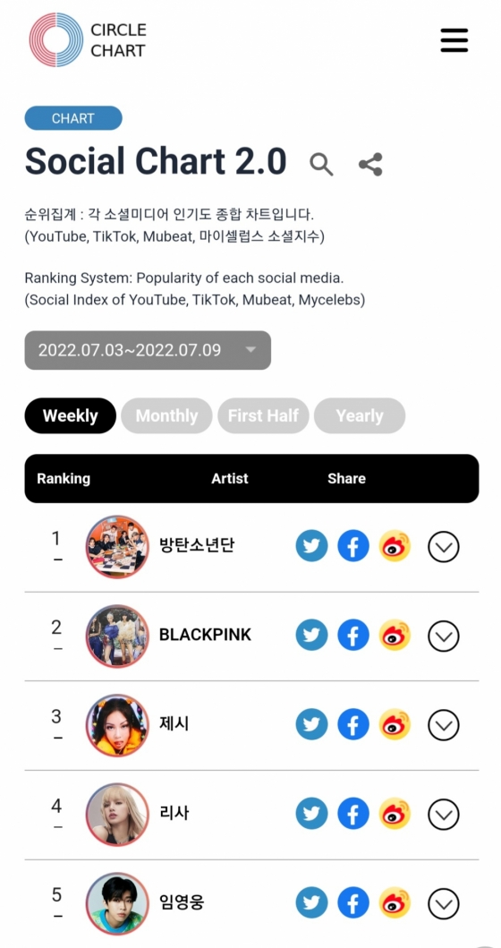 써클 소셜차트는 유튜브, 틱톡, 브이라이브, 뮤빗, 마이셀럽스 등 소셜미디어 인기도를 종합한 차트다.