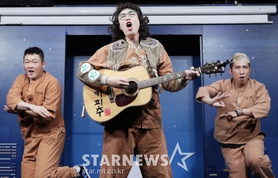 방송인 카피추(추대엽)가 14일 오후 서울 마포구 서교동 윤형빈소극장에서 진행된 신곡 '내 지갑에 있는 돈 다 갖다써라' 발매기념 쇼케이스에 참석해 멋진 공연을 선보이고 있다.