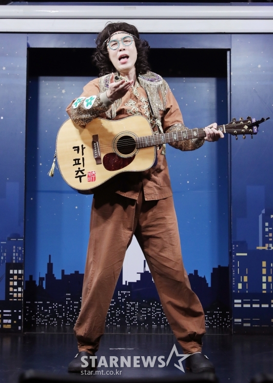 방송인 카피추(추대엽)가 14일 오후 서울 마포구 서교동 윤형빈소극장에서 진행된 신곡 '내 지갑에 있는 돈 다 갖다써라' 발매기념 쇼케이스에 참석해 멋진 공연을 선보이고 있다.