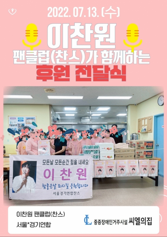 이찬원 팬클럽 '찬스' 서울경기연합(이하 '서울경기연합 찬스')는 이찬원 공식 팬카페 2주년을 기념해 7월 13일 중증 장애인 거주시설 씨엘의 집을 찾아 나눔을 실천했다.