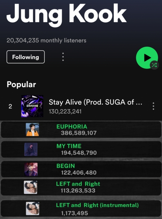 한편 정국은 스포티파이에서 찰리 푸스와 발매한 협업곡 'Left and Right'(레프트 앤드 라이트)로 한국 솔로 가수 최단 1억 스트리밍을 기록하고, 솔로곡 'Euphoria'(유포리아)는 한국 남자 솔로 최초이자 최다 3억 8600만, '시차'(My Time)는 1억 9400만, Begin(비긴)은 1억 2200만 이상 등 눈부신 기록으로 글로벌 존재감을 빛내고 있다.