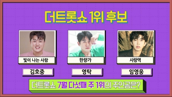 이번 주 1위 후보곡은 김호중의 '빛이 나는 사람', 영탁의 '한량가', 임영웅의 '사랑역'이다. 지난 생방송에서 김호중과 임영웅이 1위 대결을 펼친데 이어 이번 달에 새롭게 발매한 음원으로 후보에 등극한 영탁이 쟁쟁한 대결을 예고했다.