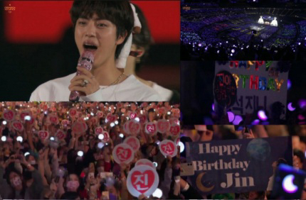 진은 또 자신의 생일 즈음 미국LA 소파이 스타디움(SoFi Stadium)에서 개최 된 콘서트에서의 팬들에게 가슴 뭉클한 감동을 안겼다. 현장의 5만여 팬들이 생일을 축하기 위해서 수작업으로 만든 진의 이름이 쓰여 있는 하트와 아미밤(BTS 응원봉)을 달('Moon', 진의 솔로곡)모양으로 씌워 불을 밝혔던, 많은 수고와 정성이 함께 했던 이벤트는 진에게 큰 감동을 주며 진은 눈물을 글썽이게 했다.