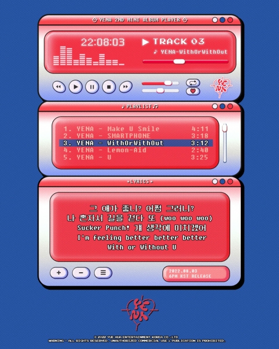 이어 두 번째 포스터를 통해 수록곡 'WithOrWithOut(위드오어위드아웃)'의 가사 일부를 공개했다. "그 애가 좋니? 어쩜 그러니? / 나 혼자서 길을 걷다 또 (woo woo woo) / Sucker Punch! 걔 생각에 미치겠어" 등의 직설적인 가사로 완곡에 대한 기대감을 높인다. 특히 해당 곡은 최예나가 직접 작사, 작곡에 참여한 곡으로 팬들의 이목을 더욱 집중시키고 있다.