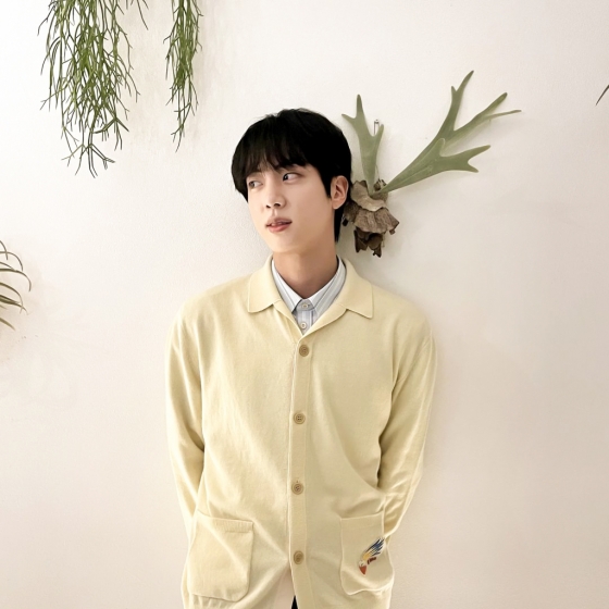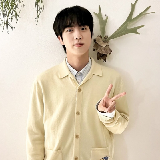 사진 속 진은 파스텔톤의 노란 카디건에 줄무늬 셔츠를 입고 손으로 브이 포즈를 취하며 상큼하고 화사한 모습으로 시선을 사로잡았다.
