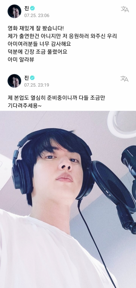 진은 "영화 재밌게 잘 봤습니다! 제가 출연한건 아니지만 저 응원하러 와주신 우리 아미여러분들 너무 감사해요 덕분에 긴장 조금 풀렸어요 아미 알라뷰"라고 전했다.