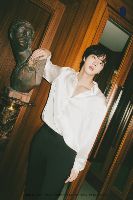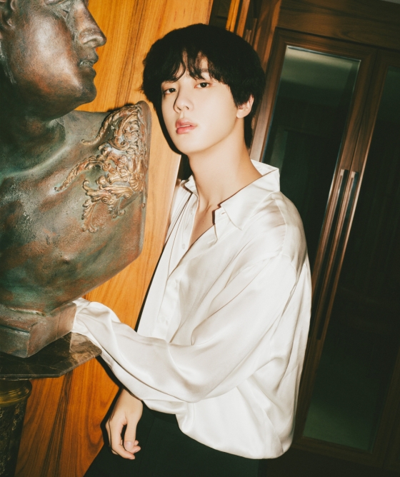 공개된 사진 속 진은 매력적인 히피펌 헤어스타일에 베이지 실크 셔츠와 블랙 팬츠를 매치해 섹시미를 자아냈다.