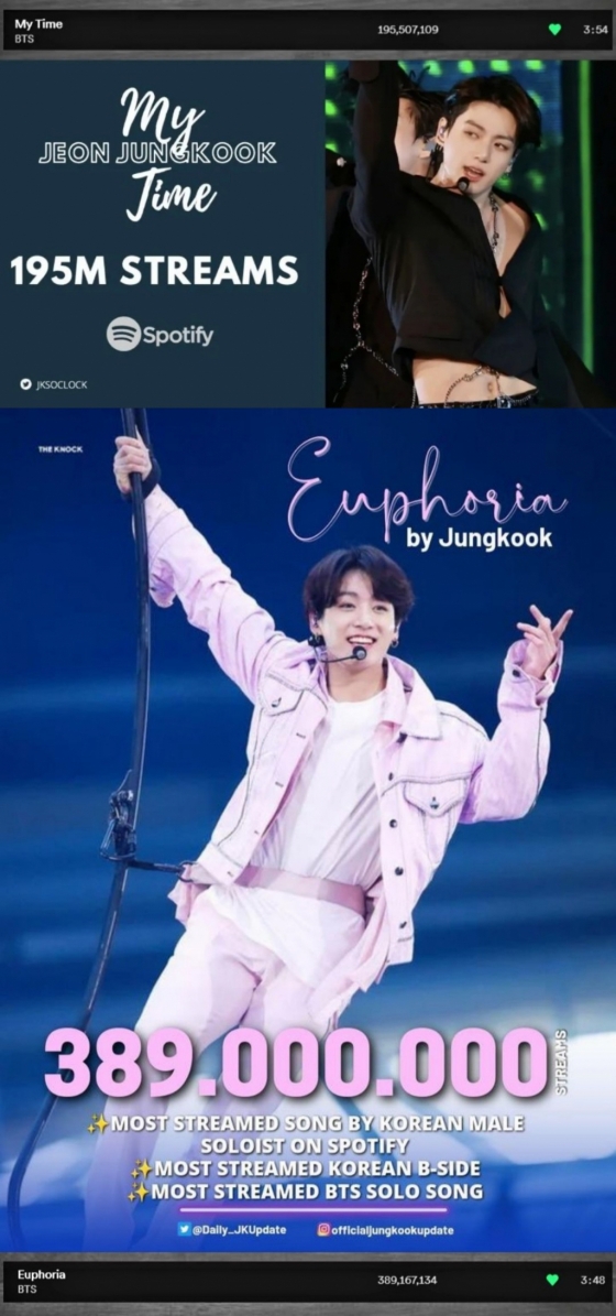 한편, 정국의 또 다른 솔로곡 'Euphoria'(유포리아)는 스포티파이에서 한국 남자 솔로곡 최초로 3억 8900만 스트리밍을 넘어서며 인기를 입증했다.