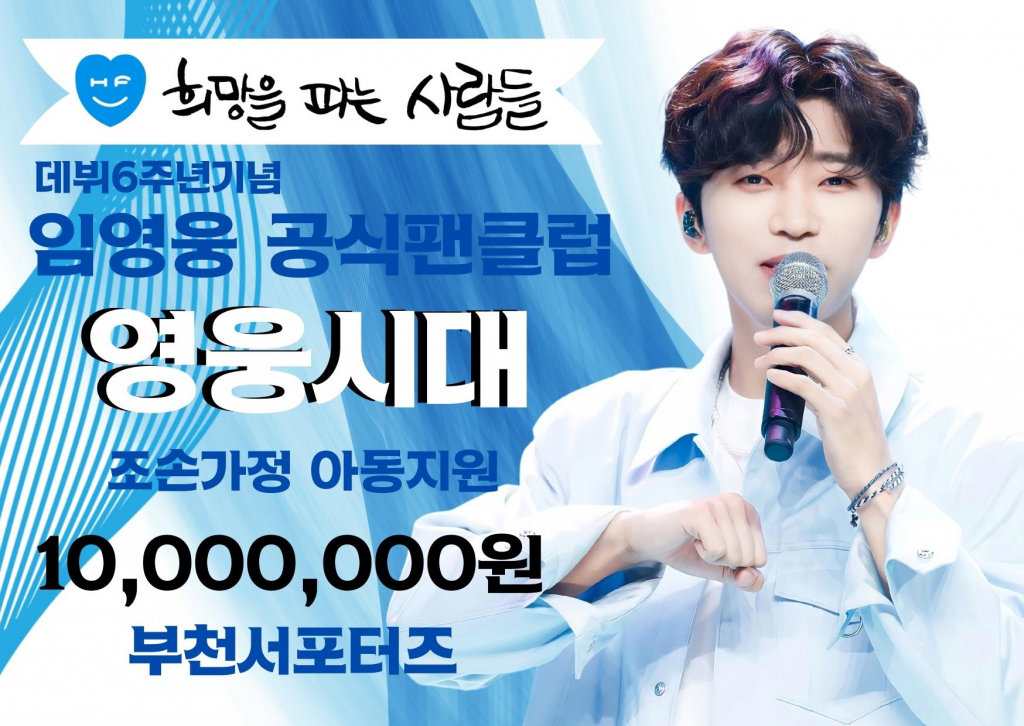 임영웅 팬카페 영웅시대 부천 서포터즈는 8월 8일 임영웅 데뷔 6주년을 맞아 전국의 어려운 조손가정 생활 지원금으로 희망을 파는 사람들에 1000만 원을 기부했다.