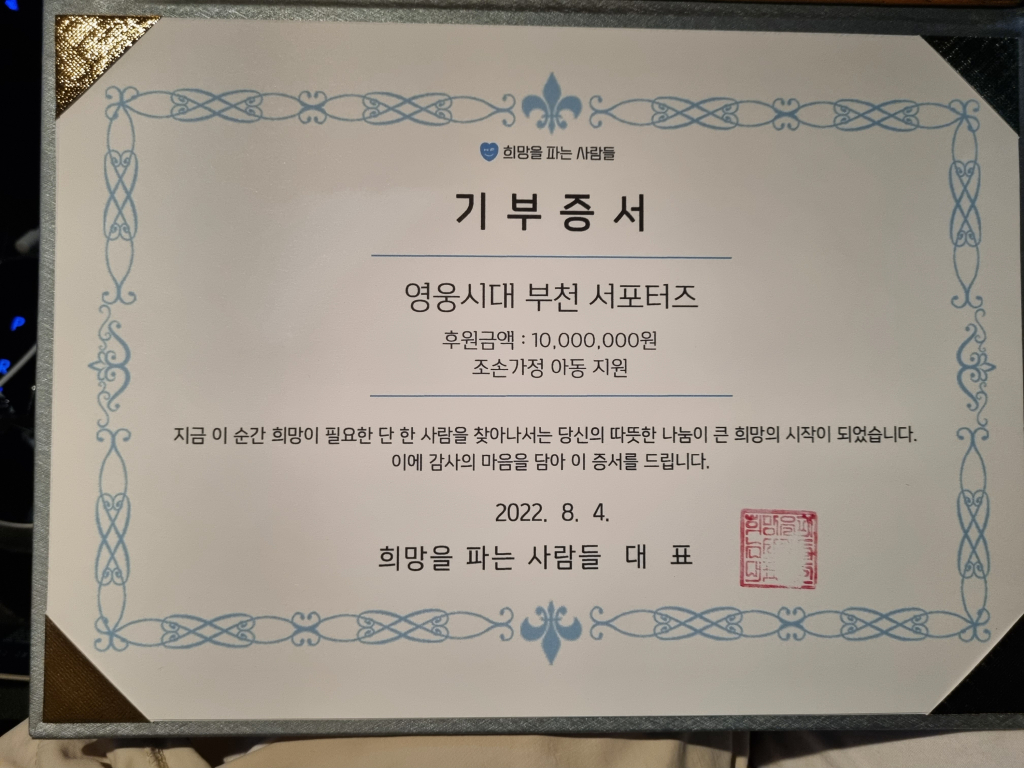 150명의 회원들이 모인 영웅시대 부천 서포터즈는 지난해 임영웅의 생일(6월 16일)을 맞아 사단법인 부천 희망재단에 500만 원을 기탁했으며, 연말에는 국제구호개발 NGO 월드비전에 국내 저소득층 가정을 위한 난방 지원비 500만 원을 기부하는 등 임영웅의 선한 영향력 실천에 앞장서고 있다.