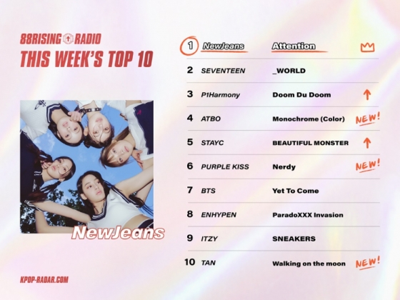 또한 이번 주 '케이팝레이더'에서 발표된 위클리 트렌딩 차트 TOP10에는 지난주에 이어 세븐틴(SEVENTEEN)의 '월드(_WORLD)'가 2위를 지켰으며, 신인 보이그룹 ATBO(에이티비오)가 데뷔곡 '모노크롬(Monochrome(Color))'으로 4위에 올랐다. 또한 걸그룹 퍼플키스의 신곡 '널디(Nerdy)'가 컴백과 함께 6위에 진입했다.