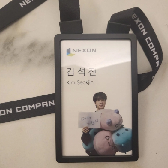 게재된 사진에는 진의 얼굴이 담긴 게임업체 넥슨 사원증이 놓여 있다. 사원증에는 진의 본명 '김석진'이 적혀 있다. 사원증 속 진은 메이플 스토리 캐릭터 인형을 들고 있다. 또한 '아미 사랑해'라고 적힌 종이도 함께 들어 팬들에 대한 사랑을 나타냈다. 진은 평소 게임에 대한 애정이 남다른 것으로 알려졌다.