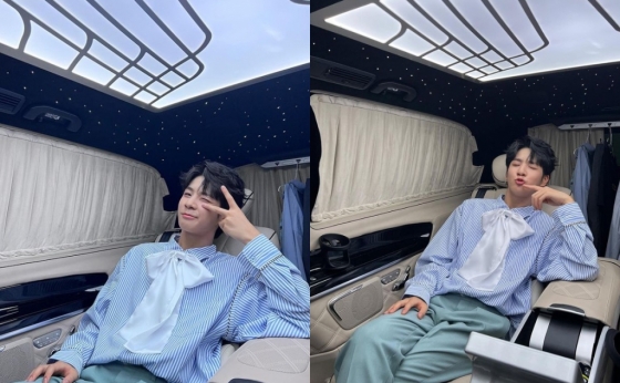 공개된 사진에는 정동원이 블루 스트라이프 셔츠를 입고 목에 왕 리본을 단 채 차 안에서 포즈를 취하는 모습이 담겼다. 마치 어린 왕자를 떠올리게 하는 상큼한 그의 의상과 표정이 시선을 끌었다.