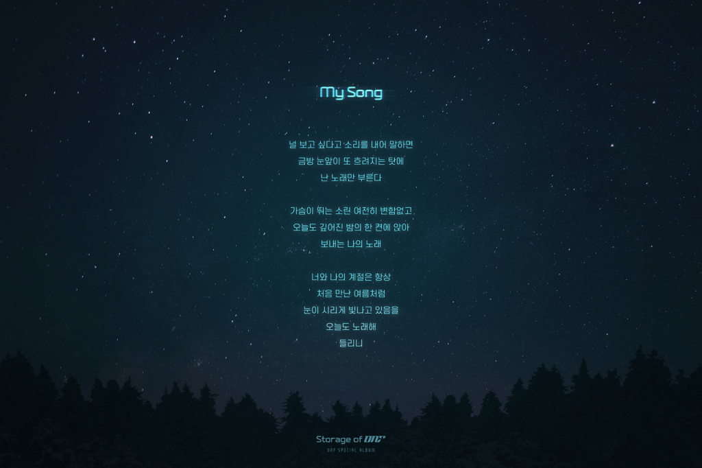 공개된 신곡 'My Song'의 가사는 '널 보고 싶다고 소리를 내어 말하면 금방 눈앞이 또 흐려지는 탓에 난 노래만 부른다', '가슴이 뛰는 소린 여전히 변함없고 오늘도 깊어진 밤의 한 켠에 앉아 보내는 나의 노래', '너와 나의 계절은 항상 처음 만난 여름처럼 눈이 시리게 빛나고 있음을 오늘도 노래해 들리니' 등이다.