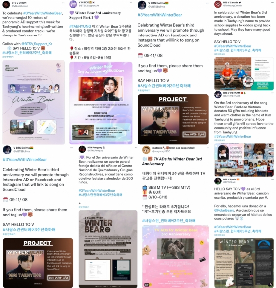 뷔의 글로벌 팬들은 '윈터 베어' 3주년을 맞아 기부와 광고, 해시태그 등 다채로운 형태로 뜨겁게 축하했다.