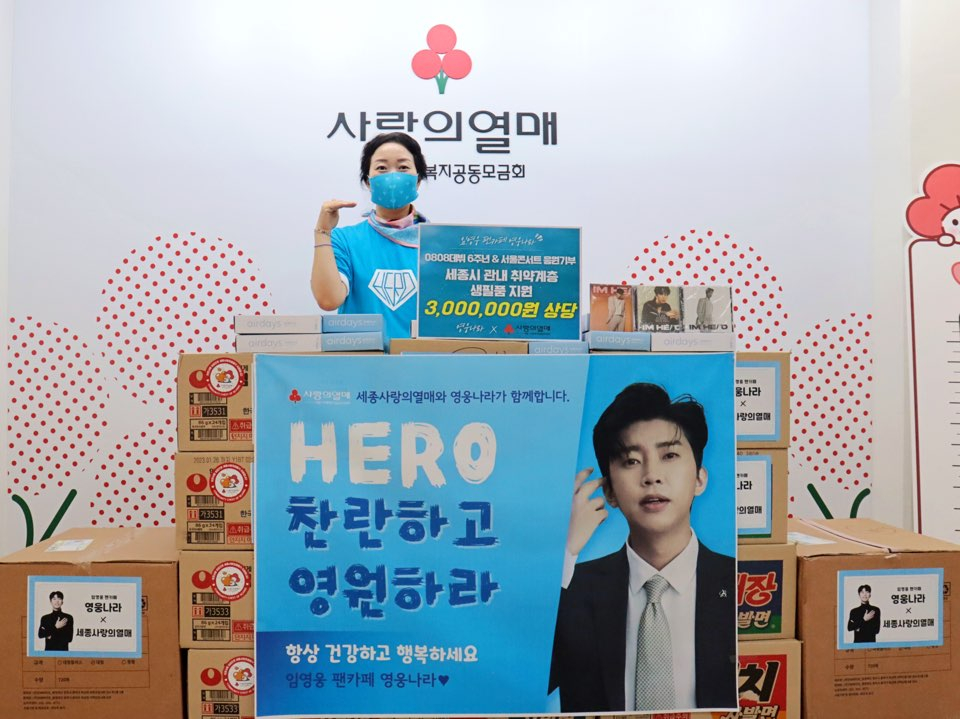 임영웅 팬카페 영웅나라는 임영웅의 데뷔 6주년을 맞아 8월 11일 사랑의열매 세종사회복지공동모금회(회장 홍영섭)에 라면, 마스크 등 300만원 상당 생필품을 기부했다.