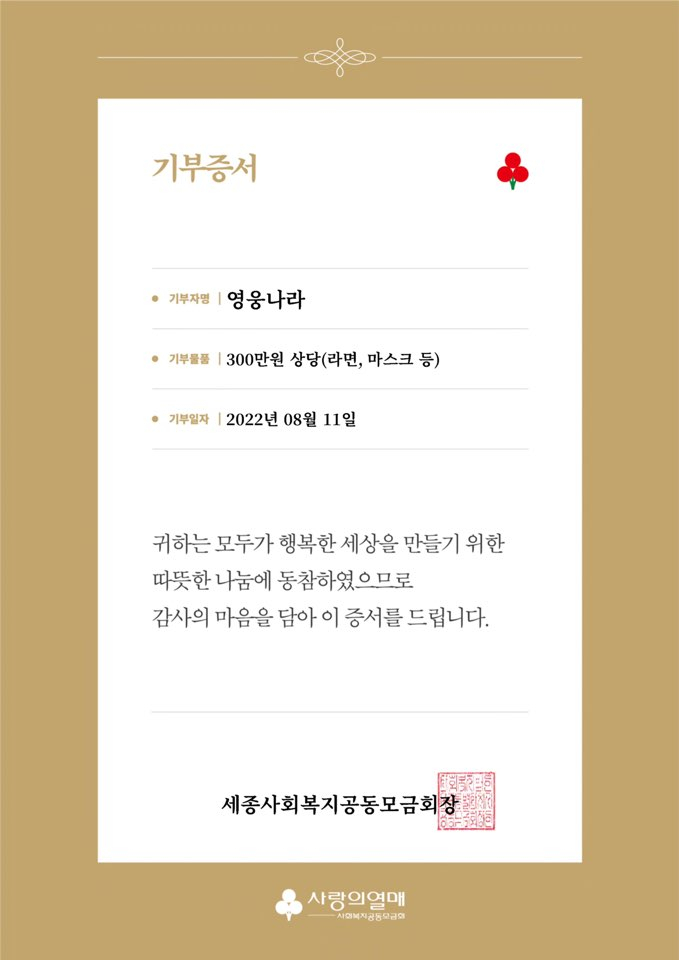 세종사회복지공동모금회(회장 홍영섭) 이경아 처장은 "세종시의 어려운 주변 이웃을 생각하는 영웅나라의 따뜻한 마음으로 기부에 동참해주셔서 감사하다"며 "앞으로 세종 사회복지공동모금회를 통해 복지의 사각지대에 놓인 이웃들까지 도움을 줄 수 있도록 노력하겠다"고 전했다.